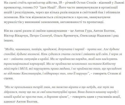 On the stage stands the organizer of the event, 35-year-old Ostap Stakhiv, a well-known provocateur in Lviv, head of the NGO Idea Nation. He was often accused of organizing actions and investigations, which led to him being thrown into a trash can and doused with brilliant green several times. He also refuses to talk to the press, accusing journalists of fulfilling an order, being biased and propagandizing.