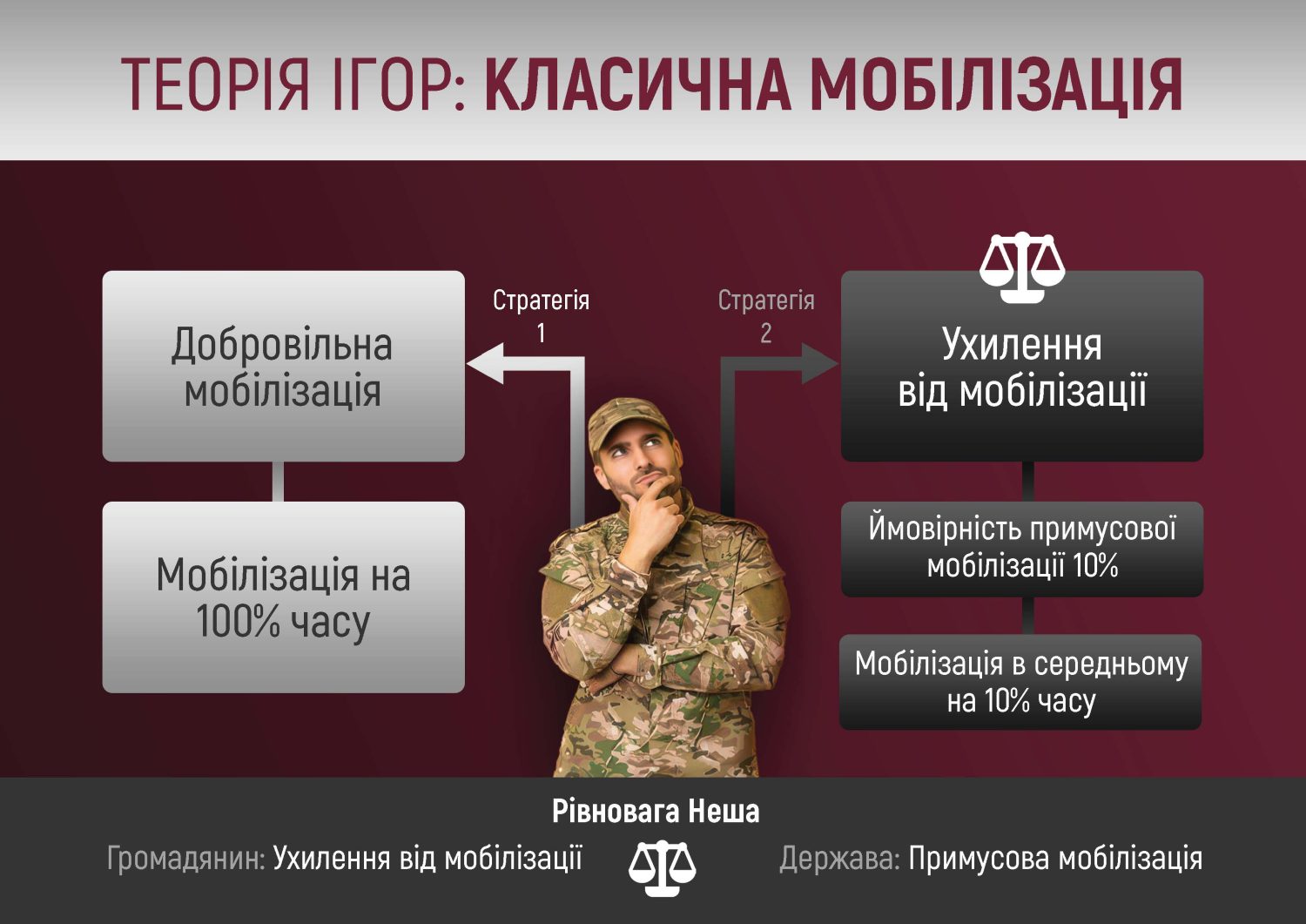 If we assume that the probability of forced mobilization is less than 100% (and in practice it is much less), then using game theory, we can formally prove that the optimal strategy for a citizen is to avoid mobilization, and for the state – to force mobilization. This is the so-called Nash equilibrium, when none of the players can change their strategy profitably on their own (John Nash is an American mathematician and one of the founders of game theory).
